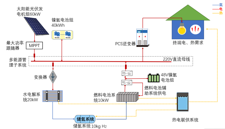 在光伏電和風(fēng)電資源豐富地區(qū),以光伏、風(fēng)電為等可再生能源制氫儲(chǔ)能結(jié)合氫燃料電池發(fā)電技術(shù),實(shí)現(xiàn)無(wú)光/無(wú)風(fēng)條件連續(xù)、穩(wěn)定的電力供應(yīng),形成完全依賴清潔可再生能源、氫儲(chǔ)能系統(tǒng)的電力保障,實(shí)現(xiàn)零碳?xì)淠芫C合利用的解決方案。